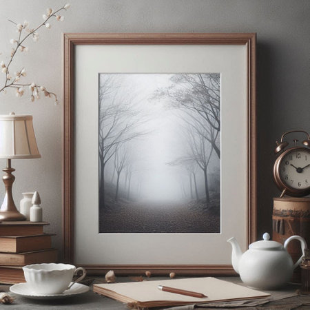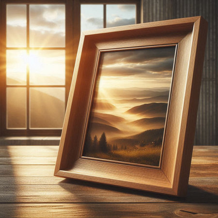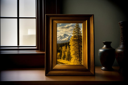 A cozy indoor scene featuring a cup of coffee beside a sunlit window with a beautiful framed landscape photo, offering a tranquil atmosphere perfect for relaxation.