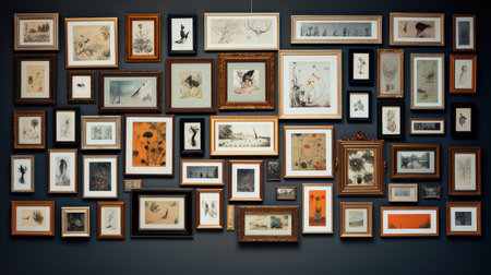 Explore a stunning gallery wall featuring a variety of modern art pieces in elegant frames. This stylish display enhances any living space with a touch of sophistication.