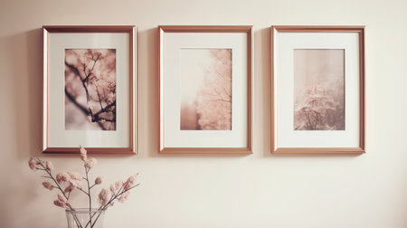 Coastal landscape art gallery wall with elegant framed seascapes and floral arrangement. That the image is generated using AI.