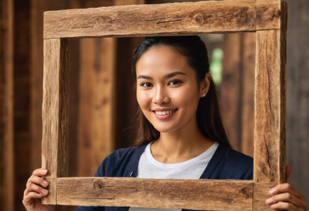 A woman holds a wooden frame, her smile framed within as she stands before a colorful background.