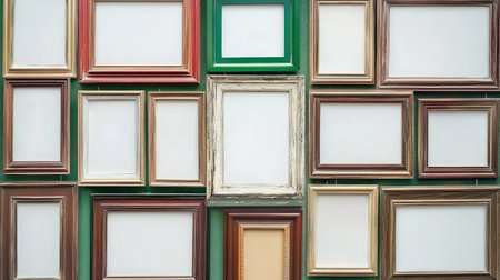 A vibrant arrangement of vintage picture frames in various shapes, ready to showcase artwork or photographs, ideal for creative home decor solutions.