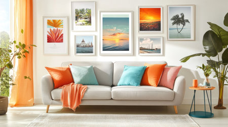 A white wall with multiple picture frames in various sizes, each featuring colorful artwork or photographs. A sleek modern sofa is placed at the center of the room, surrounded by soft orange and blue cushions. The space also includes an accent-colored side table and potted plants for added texture. There's natural light streaming through large windows, creating a bright atmosphere that highlights the vivid colors on display. --chaos 30 --ar 16:9 --v 6.1 Job ID: f7cd467f-8108-4cda-8f74-9669da478388
