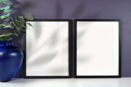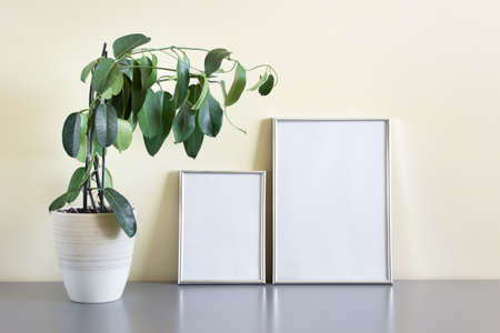 Mockup template with two silver frames A5 and A4 standing next to wall with decorative home plant in pot.