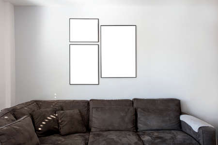 Modern interior dark sofa and tree empty picture frames on the wall, blank poster, canvas space for text in the living room