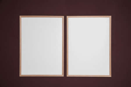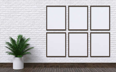 Mock up poster frame in interior wall. White frame for poster or photo image on brick loft wall in home room or office interior