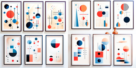 Stylish framed fine art prints arranged in a grid pattern, highlighting bold colors and abstract designs.