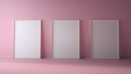 Blank three photo frames on light pink wall mock up. 3d rendering