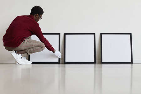Full length portrait of African-American man setting up blank black frames on floor while planning art gallery or exhibition, copy space