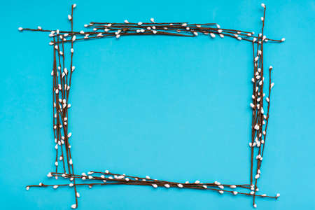 Bright frame of artificial willow branches on a blue background. Top view. Copy space