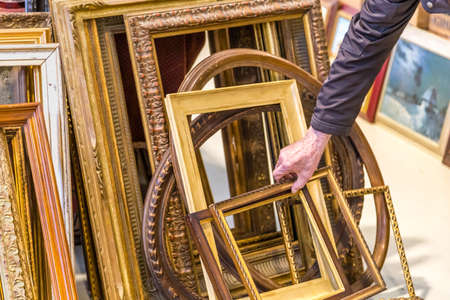 CESENA (FC) - FEBRUARY 17, 2019: hand of seller holding frames for sale on stalls at antique fair