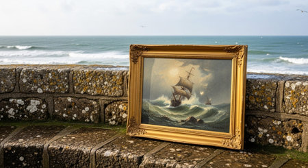 Coastal landscape art gallery wall with elegant framed seascapes and floral arrangement. That the image is generated using AI.