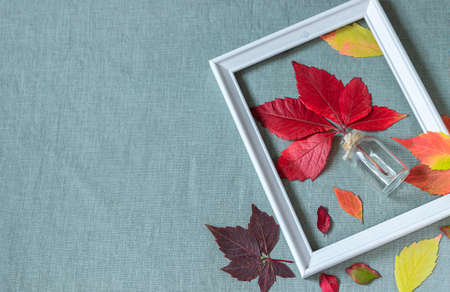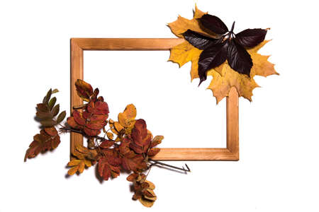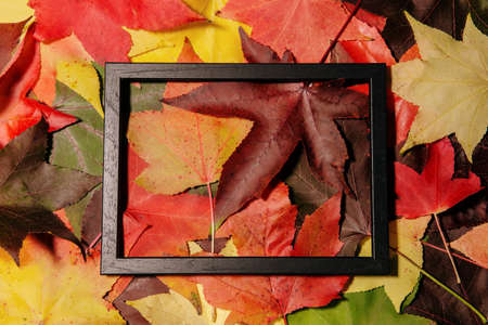 Red, orange, yellow and green autumn leaves background with white frame made of wood. Minimal concept idea.