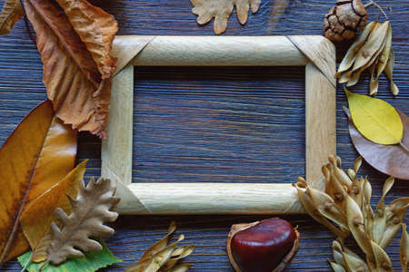 Autumn concept. Frame with autumn leaves on dark rustic background. Flat lay, space for text