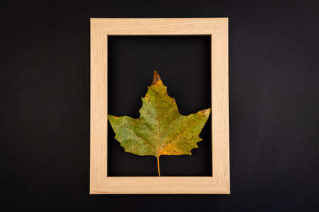 Autumn composition. A frame of autumn fallen leaves on a beige background. Green maple leaf in a wooden frame. Flat layout, top view, copy space