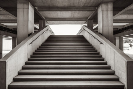 Low-angle view of marble stairs leading to an open sky, framed by white walls and black railings. Minimalist architectural design with natural light and shadow contrast. Selective focus.