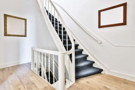 Designed in a minimalistic style staircase hall. Interior of luxury house stairs