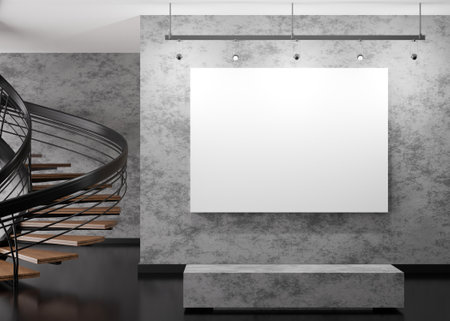 Empty white horizontal canvas on concrete wall in modern art gallery. Mock up interior in contemporary style. Free, copy space for your picture. Exhibition space. 3D rendering.