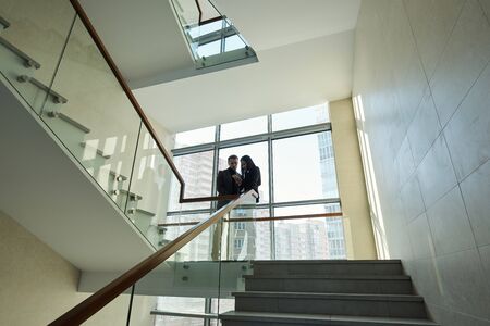 Two young colleagues in formalwear standing by railinigs between staircases inside large contemporary business center