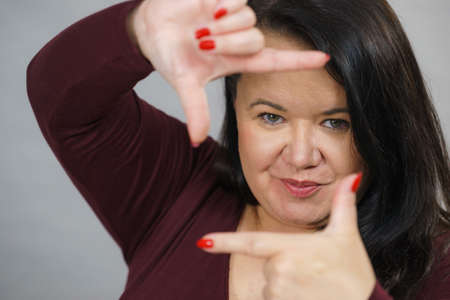 Plus size woman having fun, making frame with hands, taking picture with imaginary camera, on grey
