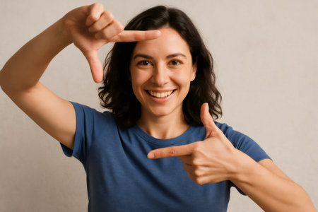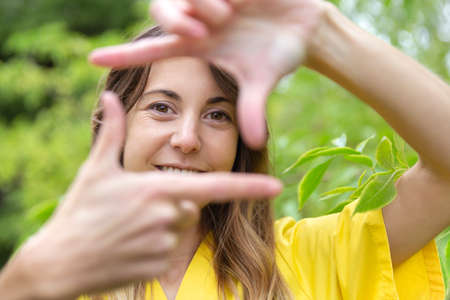 Cheerful young woman making a framing gesture with her fingers, expressing creativity and capturing a moment