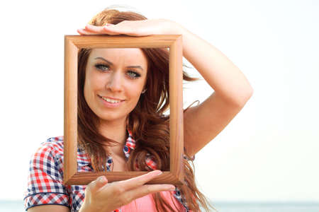 Woman sea sky vacation Holding Frame travel concept
