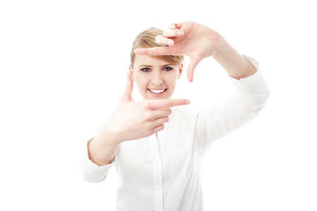 Woman showing framing hand gesture on bright background.
