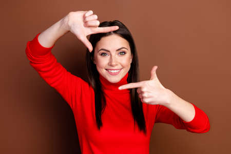 Photo of nice optimistic brunette hairdo lady do snap wear red sweater isolated on brown color background