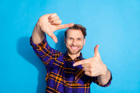 Photo of sweet charming young guy wear plaid clothes showing camera gesture isolated blue color background