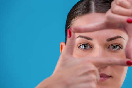 Beauty portrait of a young attractive Brunette woman with perfect skin posing and showing frame with fingers. Indoor, studio shot on blue background