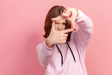 Portrait of curious brunette teenage girl with curly hair in hoodie looking through photo frame gesture made of hands, capturing moments. Indoor studio shot isolated on pink background