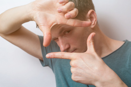 Men look through the frame of the fingers. Gray background