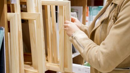 Closeup image of young female artist choosing wooden frame in hobby store.