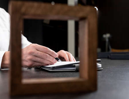 Man hands holding pen and taking notes in notebook. Businessman hand writing in office. High quality photo