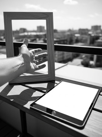 Tablet with blank screen on the balcony. Black and white photo.