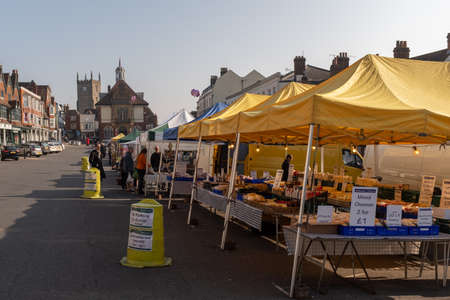 Marlborough, Wiltshire, England, March, 30, 2019: The traditional Saturday market in the historic town of Marlborough, England, the nearest stall is selling cheeses