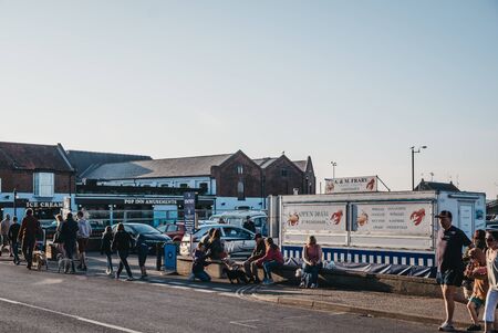 Wells-next-the-sea, UK - April 20, 2019: People walking on a street in Wells-next-the-sea, a seaside town and port in Norfolk, UK, famous for its beach.