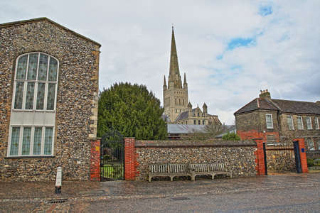 The Cathedral with medieval houses and stone walls in the foreground, Norwich, Norfolk, UK