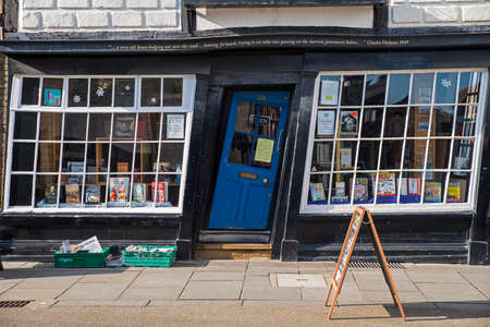 CANTERBURY, UK - FEBRUARY 13TH 2017: A slanted door to a bookshop in the historic city of Canterbury in the UK, on 13th February 2017.