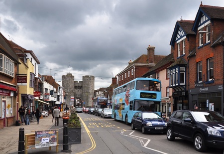 Canterbury, United KIngdom - April 20, 2012: The main street and original fortified gates of the historic town of Canterbury.