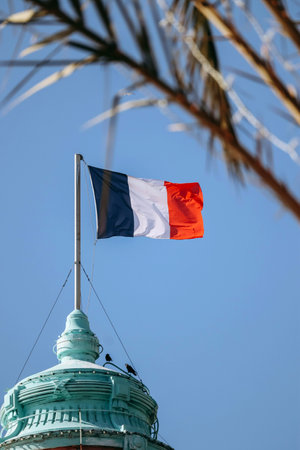 Close-up of the French flag on the roof of the Hotel Negresco on the Promenade des Anglais in Nice