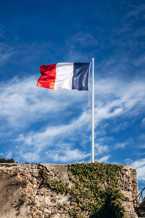 Roquebrune Cap Martin, France - February 9, 2025: French national flag flying above the stone walls of Grimaldi Castle against blue sky