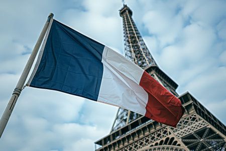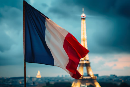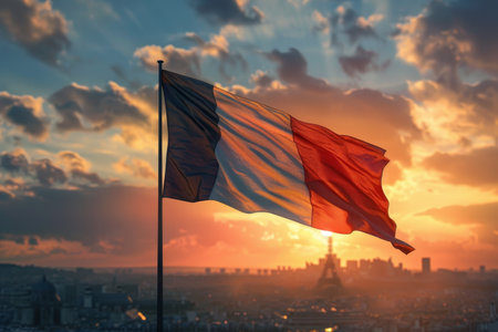 France tricolor flag fluttering against urban skyline, symbolic representation of French identity