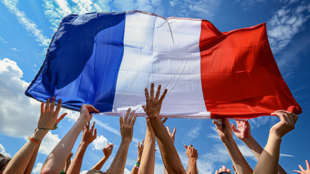 French olympic athletes proudly waving national flag at games in France, Olympic sport games concept, banner