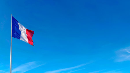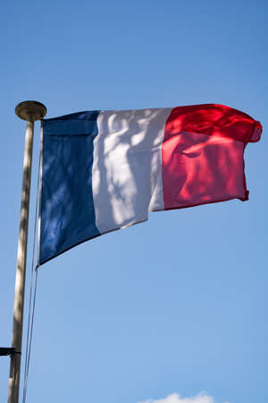 The French flag is fluttering in the wind against the clear blue sky. Copy space for text.