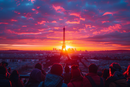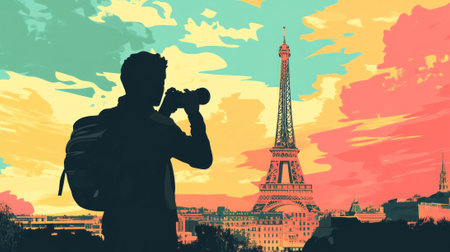 A young caucasian male photographer stands silhouetted against a vividly colorful sky, capturing the eiffel tower at sunset. his backpack suggests travel and adventure, while the scene exudes a modern and artistic flair.