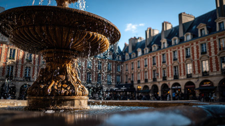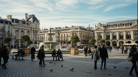 Bustling city square featuring elegant historic buildings, a central fountain, and people walking and sitting outdoors