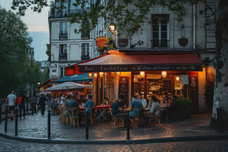 A group of people enjoying their meals while seated at tables outside of a restaurant, A charming cafe exterior on a bustling Parisian street at dusk, AI Generated
