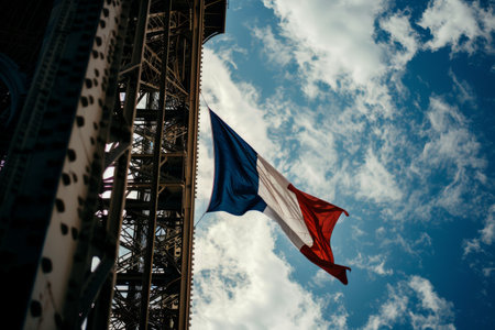 Image of flag of france over eiffel tower. Fete nationale francaise, patriotism and celebration concept digitally generated image.