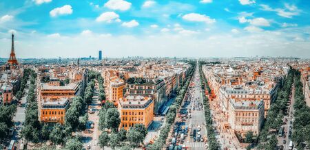 PARIS, FRANCE- JULY 06, 2016 :Beautiful panoramic view of Paris from the roof of the Triumphal Arch. Champs Elysees and the Eiffel Tower.