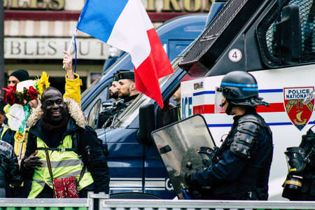 Paris France May 04, 2019 View of a riot squad of the French National Gendarmerie in intervention during protests of the Yellow Jackets against the policy of President Macron in Paris on saturday afternoon
